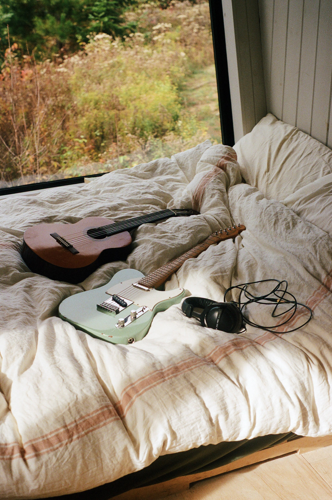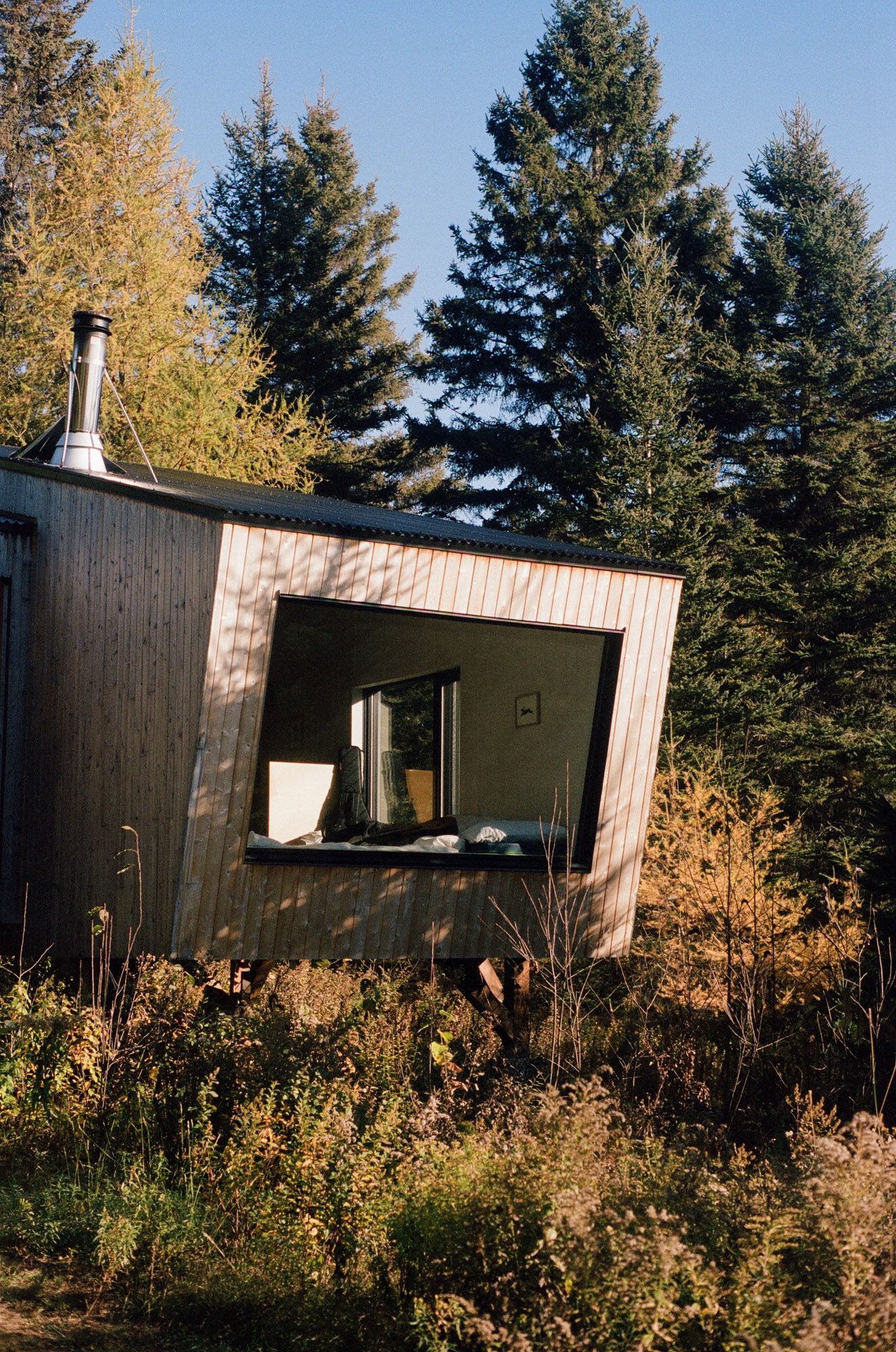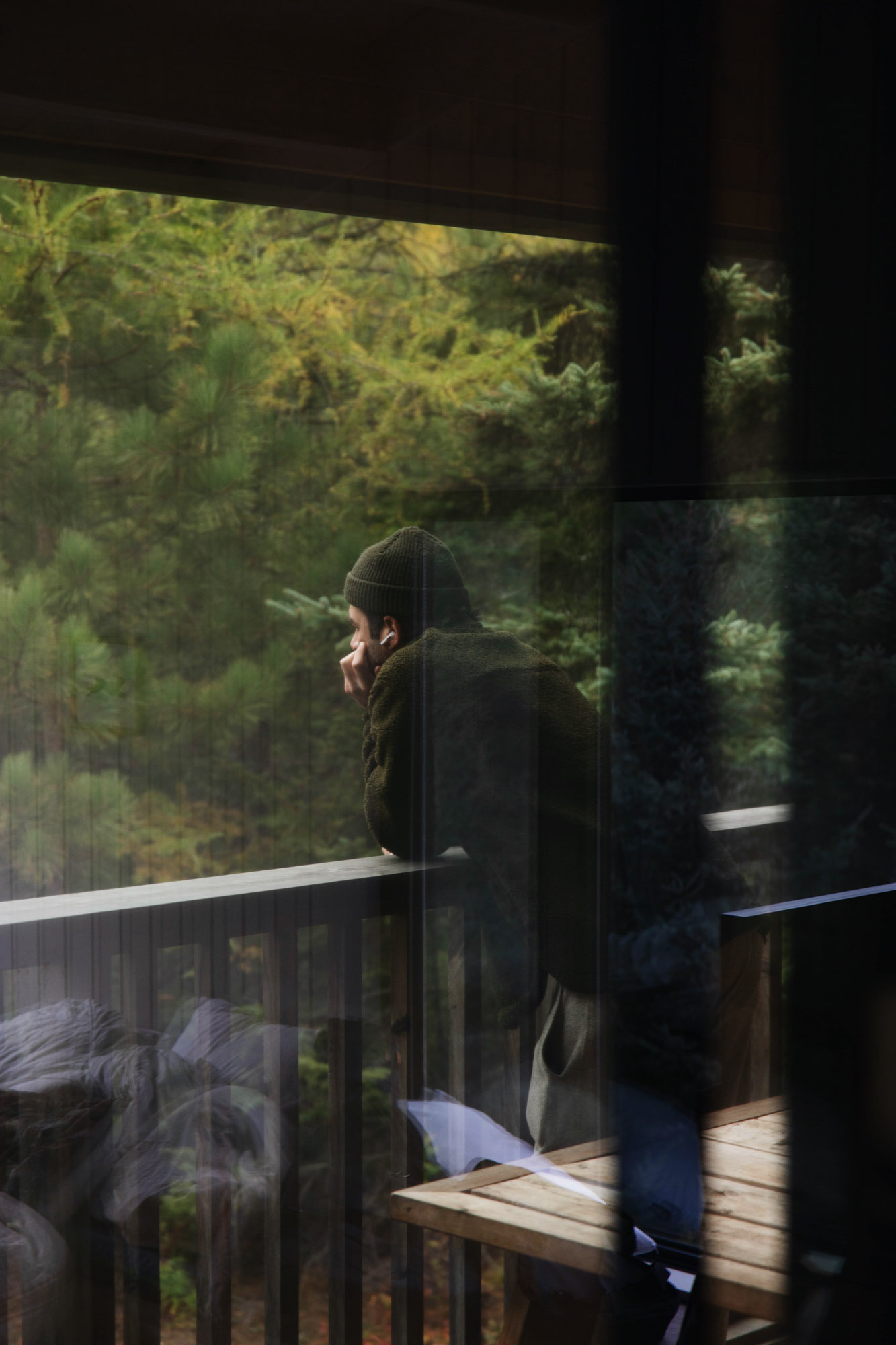 Dès qu’il en a l’occasion, Geoffroy s’évade dans le bois pour faire des feux, jouer de la guitare ou juste, s'en remettre au silence. Son séjour à Territoire Charlevoix incarne parfaitement ce genre de parenthèses. Dans ce petit refuge perché à flanc de montagne, le temps ralentit, le regard porte plus loin et les idées, parfois, viennent. C’est d’ailleurs là, près de la nature et loin des distractions qu’il aime finir ses projets, ou affiner tout ce qui peut l’être en dehors du studio.
