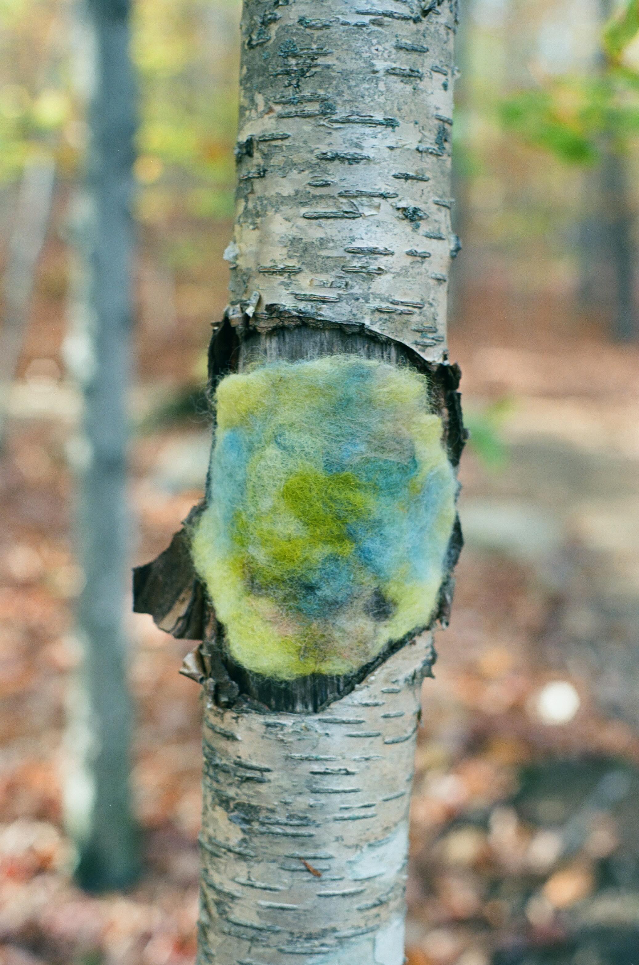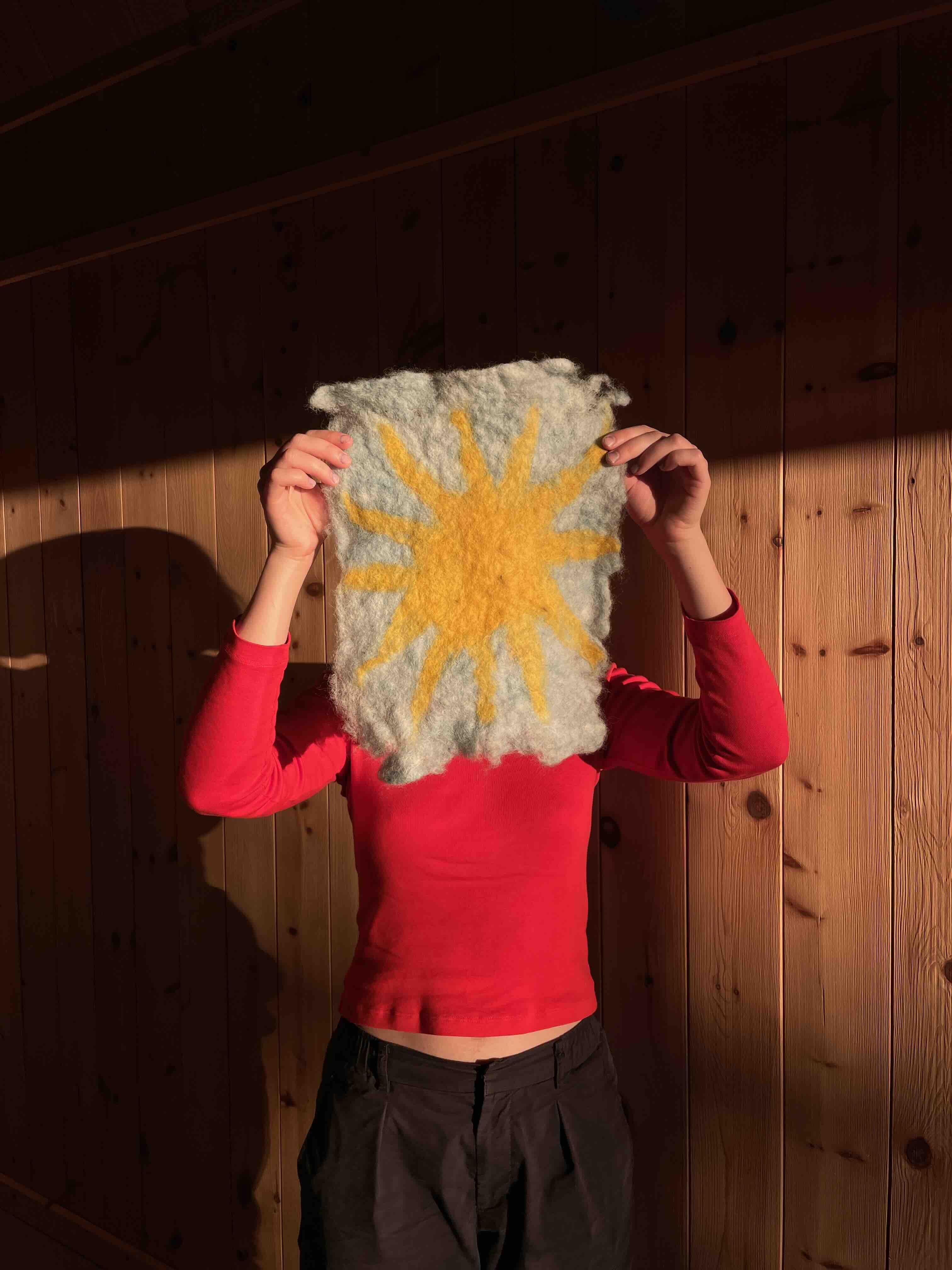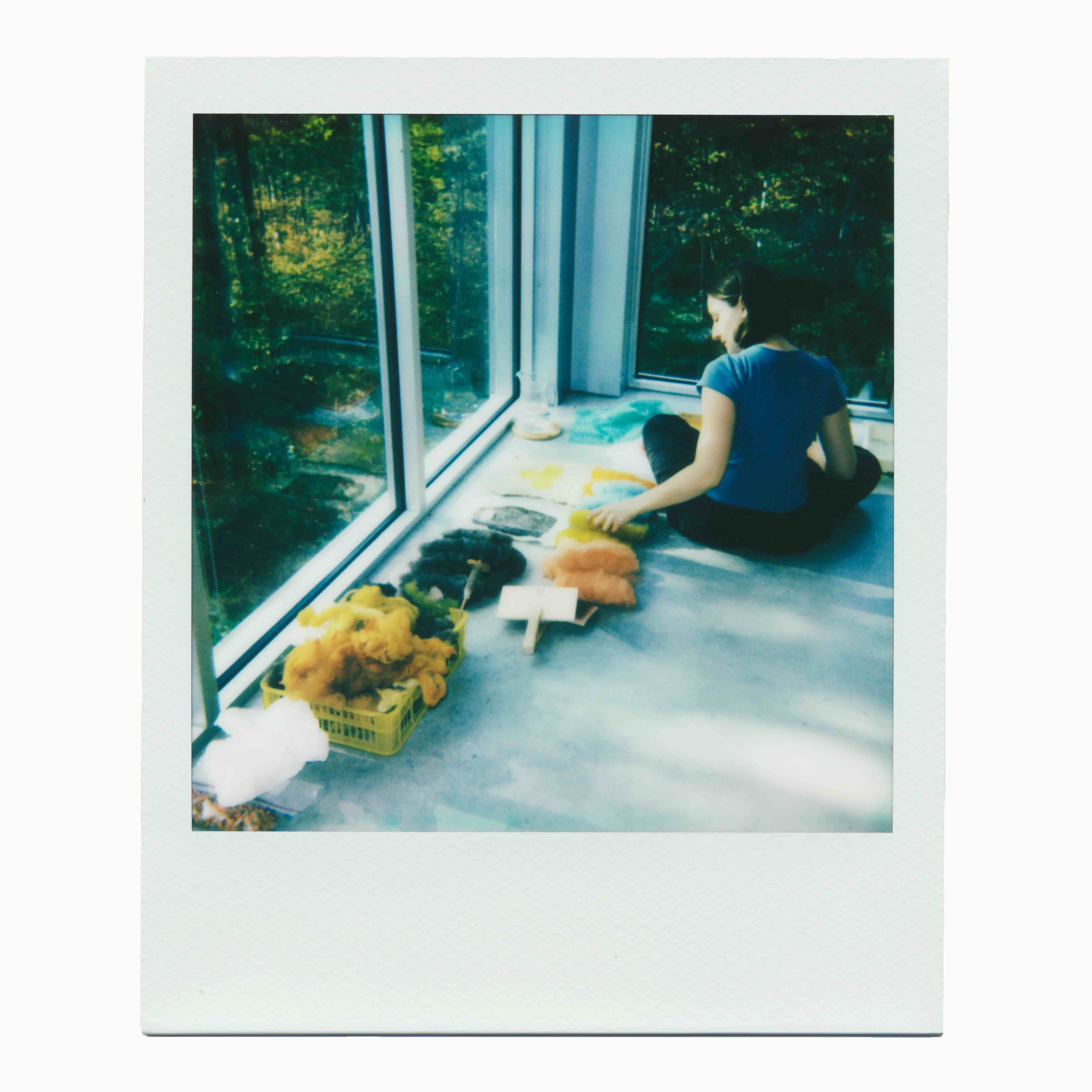 Dans le cadre de sa résidence à BESIDE Habitat, Béatrice a investi le chalet avec un ensemble de laines teintes naturellement et l’envie d'expérimenter le feutrage à l’eau et au savon. Le lieu a agi comme un véritable catalyseur de sa pratique artistique et plusieurs pièces sont nées de ce bref passage en forêt, chacune inspirée par les couleurs du feuillage ou des lichens qui bordent les sentiers. L’une des pièces qu’elle a réalisée représente une sonnaille de mouton, une cloche dont la forme peut varier et qui permet d’identifier les troupeaux ou encore à un agneau de reconnaître sa mère. Une autre pièce, un touski de laine feutrée, incorpore les rebuts des autres œuvres et incarne sa philosophie : rien ne se perd, tout se transforme immanquablement.