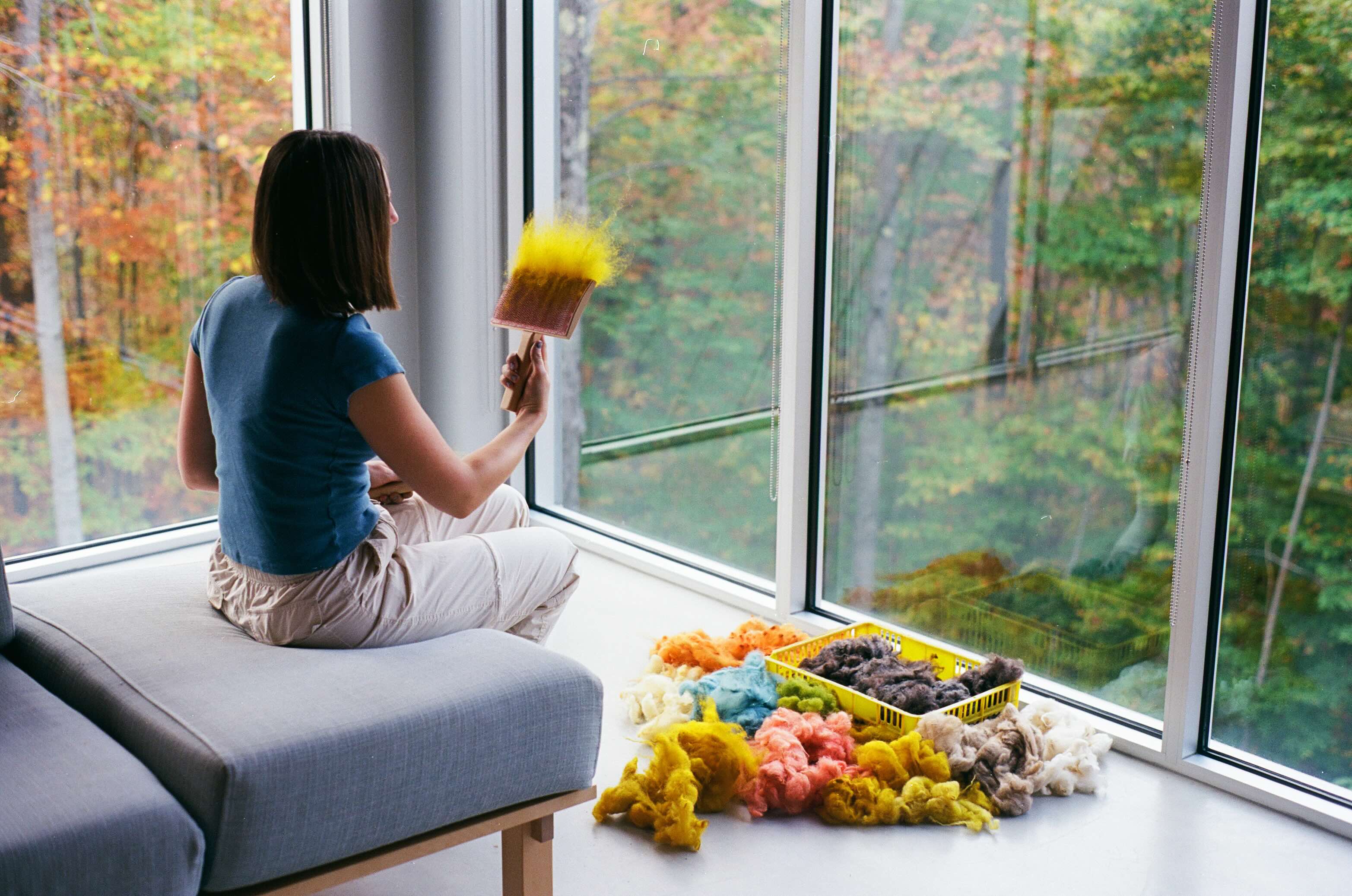 Designer graphique de formation, tisserande et artiste multidisciplinaire, Béatrice Dubreuil bâtit une pratique où les gestes manuels, la proximité avec le territoire et le respect du vivant forment une même trame. « Le fil conducteur entre tous mes projets est l’envie de créer de mes mains et la curiosité d’essayer des choses nouvelles », explique-t-elle. Inspirée par l’univers pastoral, les animaux, la teinture naturelle, elle puise dans ce qui se présente à elle : une lumière singulière, une texture distincte, un son qui l’émeut, une matière qui évolue. Sa pratique s’est construite autour d’une attention au minuscule et a été façonnée par une enfance où la création faisait partie du quotidien.
