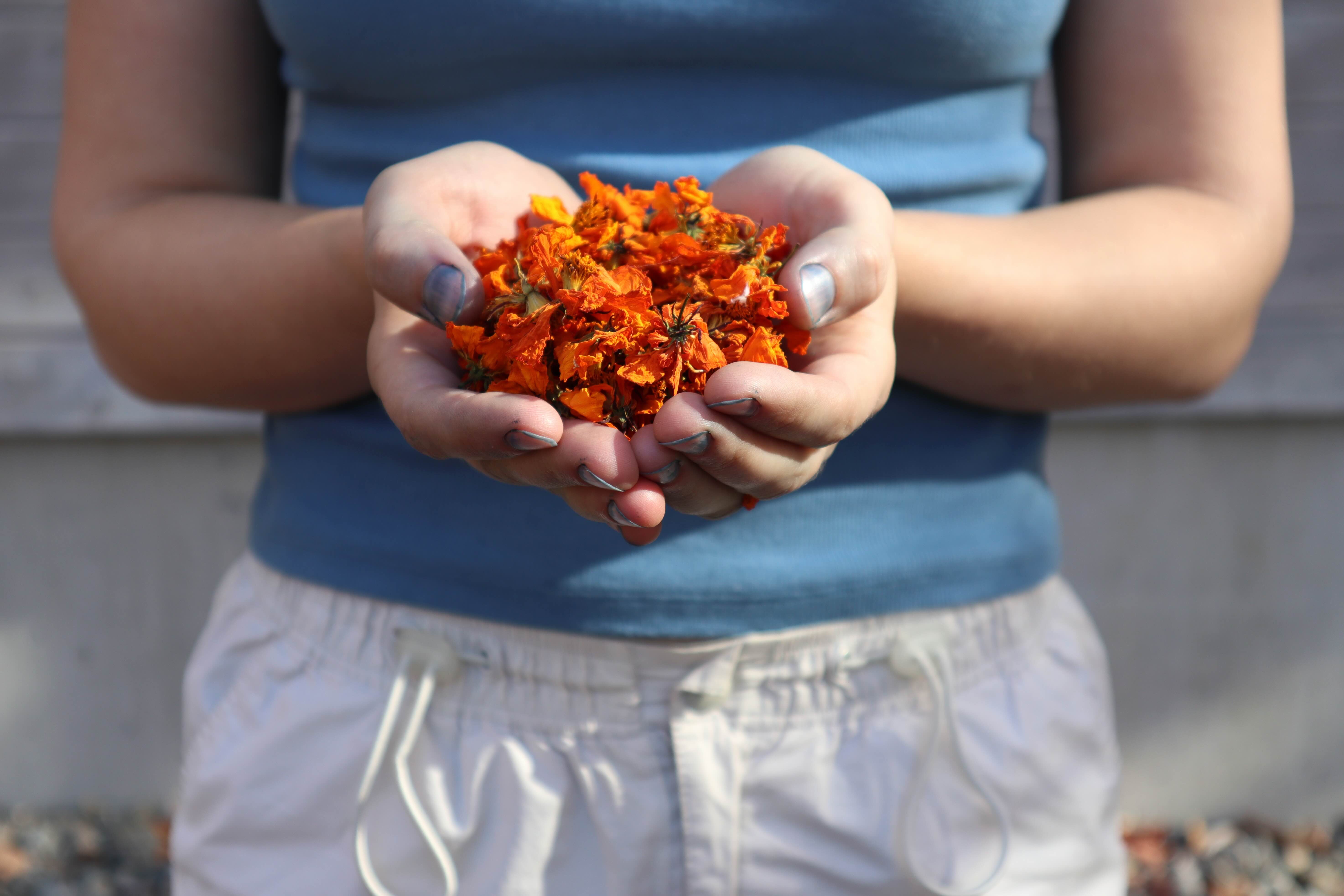L’envie de cultiver des plantes tinctoriales, quant à elle, est née après qu’elle a pris conscience de l’impact des fibres synthétiques, malgré l’attrait de leurs couleurs. « J’ai toujours aimé le jardinage pour le plaisir de prendre soin des plantes. La teinture végétale s’est imposée tout naturellement. J’avais envie d’être en contact avec les matières premières et suivre l’origine des couleurs », explique l’artiste. Béatrice a suivi des formations avec Couleurs locales et habi habi au Québec, en plus d’un atelier de shibori au centre awonoyoh au Japon — qui produit son propre sukumo (indigo fermenté) de façon traditionnelle. Elle se met ensuite à cultiver l’indigo sur son balcon, puis, grâce au jardin communautaire de sa tante, elle élargi sa palette : le cosmos sulfureux pour du orange, la tagète pour du jaune, la scabieuse noire pour du violet, la garance pour du rouge, et la renouée des teinturiers (indigo) pour du bleu. « Je pense que de pouvoir cultiver mes propres couleurs donne un sens plus profond au processus », admet-elle. Dans sa démarche, la matière compte autant que la forme. La provenance des matériaux et la trace de son geste témoignent du soin qu’elle consacre à chaque étape. « Chaque pièce que je teins ou file renferme une histoire qui dépasse l’objet — une histoire de territoire, de gestes et de relations », confie-t-elle. Cette manière de penser le geste créatif trouve un écho chez Élisabeth Cardin, qui rappelle dans La mémoire des matériaux qu’un objet réalisé à partir de fibres naturelles et selon des techniques enracinées dans un territoire témoigne de l’identité et des coutumes d’un peuple, et dégage une profondeur et une authenticité particulières.